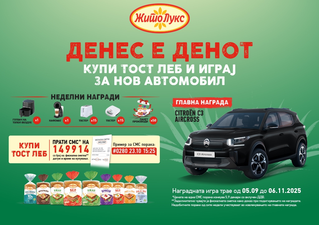Купи 1 тост леб на Жито Лукс по твој избор, испрати го бројот на фискалната сметка** испишан на горниот дел од сметката, датумот (ден и месец) и времето на купување наведени на сметката (час и минути) преку СМС-порака* на телефонскиот број: 149 914 и учествувај во ГОЛЕМАТА НАГРАДНА ИГРА.