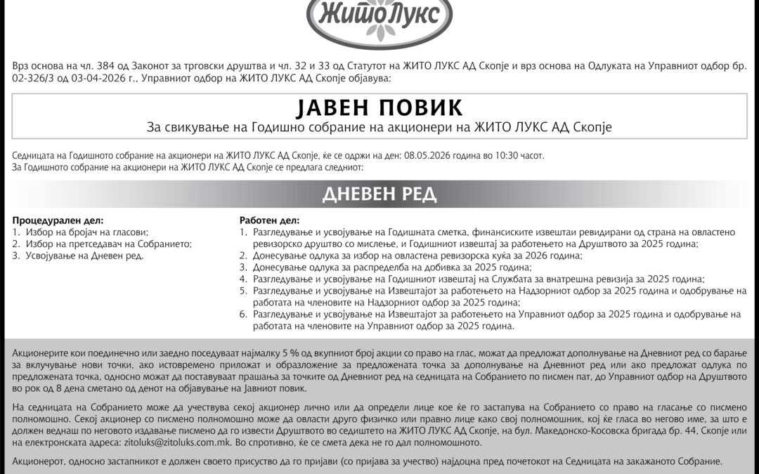 ЈАВЕН ПОВИК ЗА ГОДИШНО СОБРАНИЕ НА АКЦИОНЕРИ